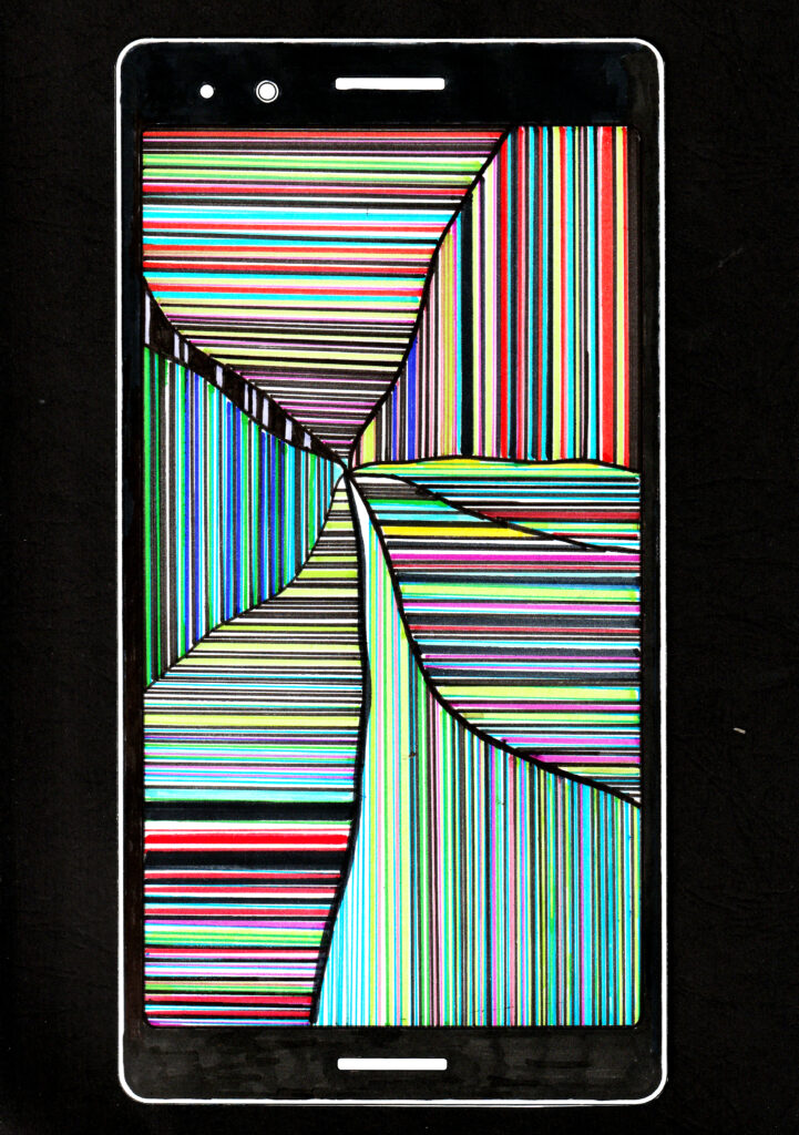 • Création en arts plastique. Représentation (sur papier) d’écrans de smartphone cassés, à partir de lignes colorées, dans le style du glitch art.
